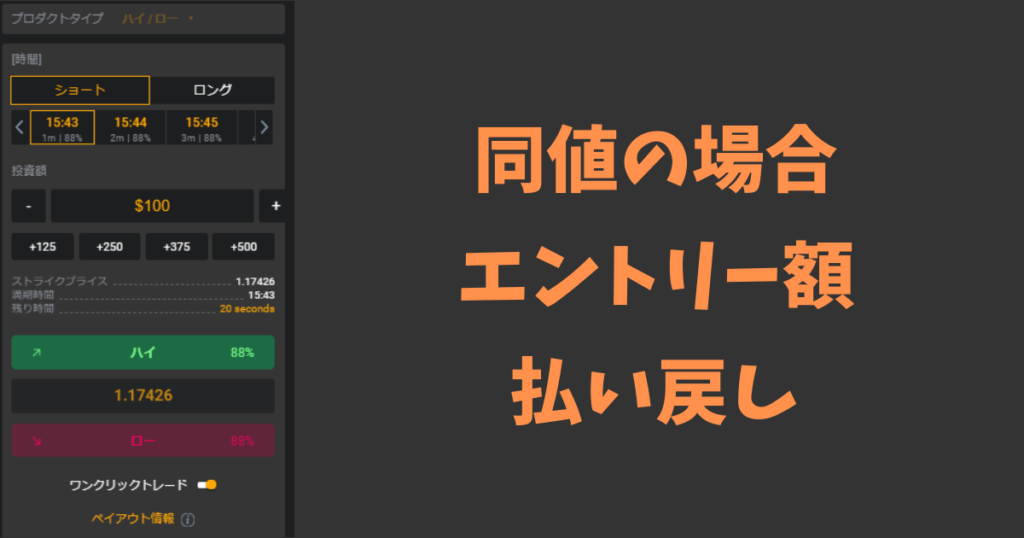 Bi-Winningでは同値になったときに引き分け判定となりエントリー金額が返金されます。