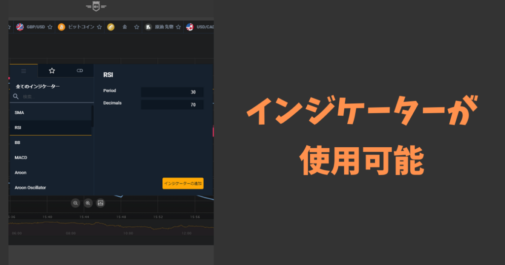 「インジケーター」をクリックし表示させたいインジケーターを選択でチャートに表示することが可能