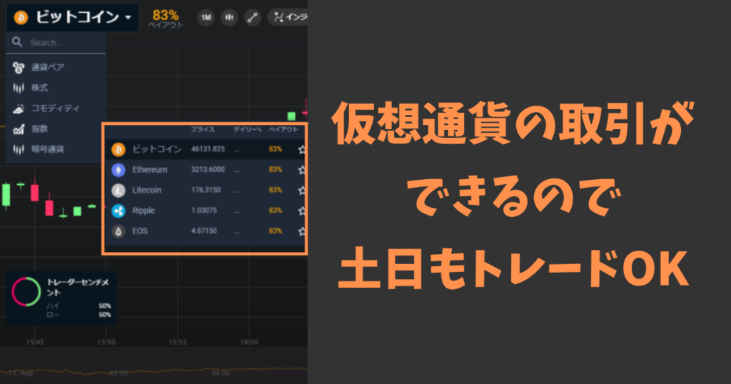 • BTC・ETHなど仮想通貨の取引ができるので土日もトレードOK