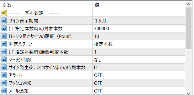 例えば「30000」と入力すると、最新のローソク足から過去30,000本分の範囲でサインが表示されます。