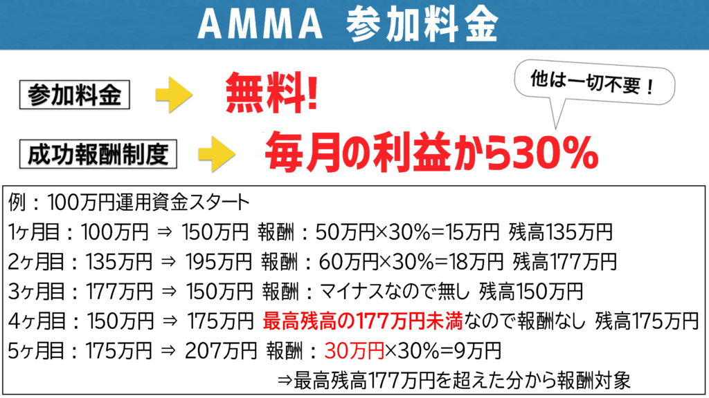 ◯取引費用(スプレッド)の一定割合が投資顧問報酬または売買シグナルサービス料金として認識されるほか、AMMAにおいては、月々の投資家さまの利益(ただし助言または売買シグナル提供以来の過去最高月末アセットを上回る場合に限る)に比例した成功報酬も発生するのが特徴です。