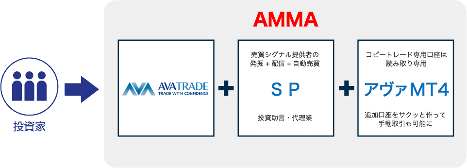 AMMA(あんま)はこの技術をスクラップ・アンド・ビルドし、アヴァトレード・ジャパンの法令遵守態勢(第一種金融商品取引業、投資助言・代理業)にマッチングさせたものです。