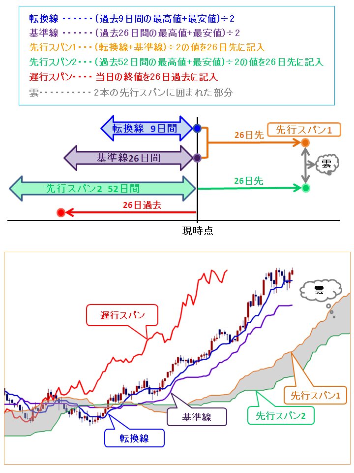 一目均衡表が他のテクニカル指標とまったく違う部分は、為替レートやその平均値を未来や過去にずらして、「雲」や「遅行線」を描画し、売買判断に使用するところです。