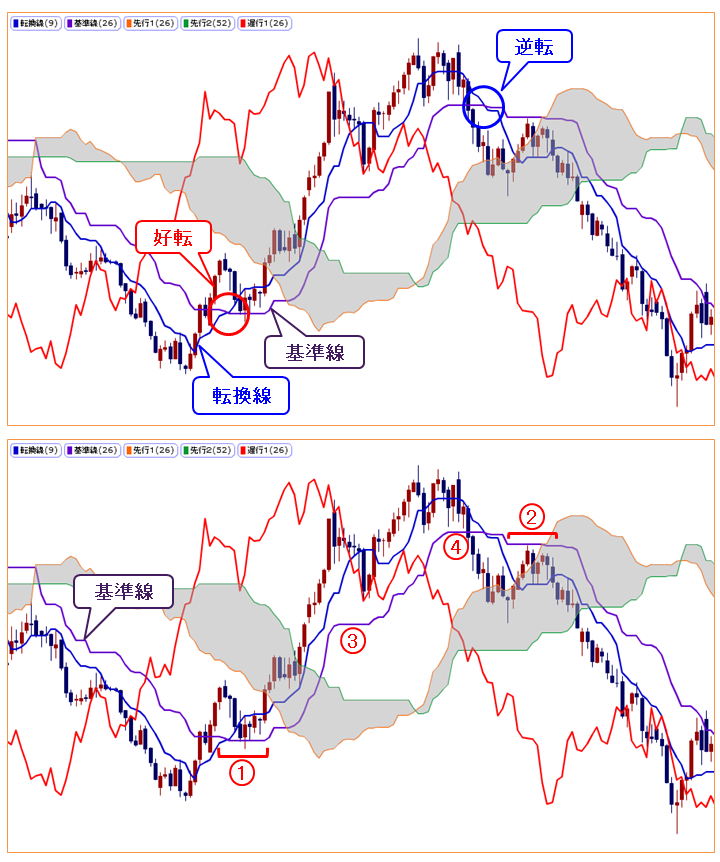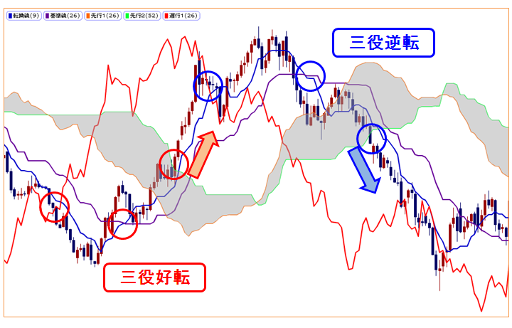 日々線が雲を上抜ける場合は相場の方向性が「好転」、下抜ける場合には「逆転」するとしており、相場の転換シグナルと判断します。