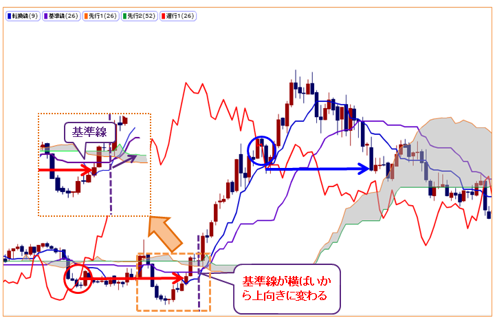 現状の相場の流れを見る場合には、基準線が上向きなのか、下向きなのか、横ばいなのかを見極めることが重要です。